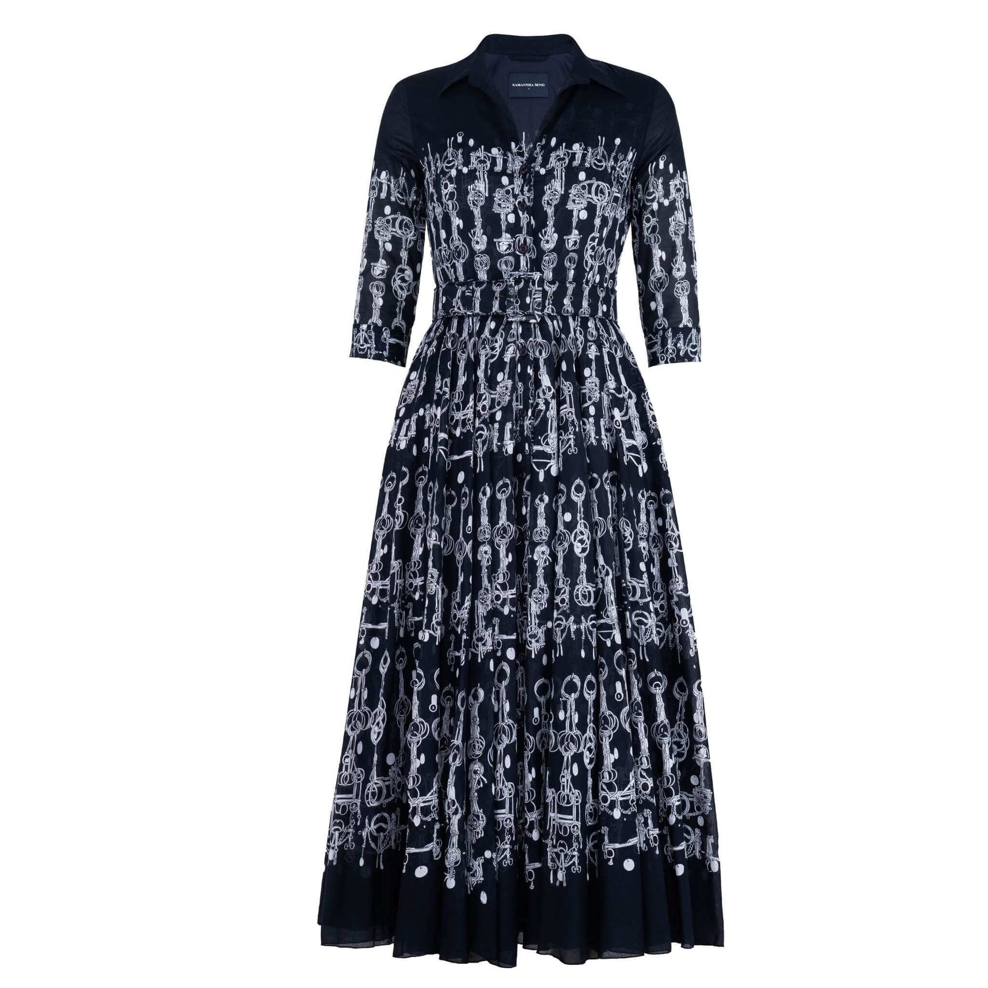 The iconic Audrey #4 silhouette features a crisp shirt collar, elegant 3/4 length sleeves, and a classic button-front design. This particular version stands out with its bold, wide black buckle belt, which dramatically cinches the waist for a strikingly modern and flattering silhouette. The full, pleated A-line skirt adds graceful volume and movement, ensuring a polished and confident look for any occasion.